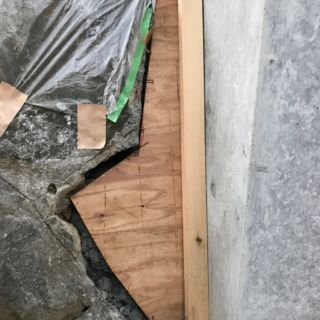 旅館の室内エントランスホール内に石を繋ぎ庭を作った際、当初7ミリ程あった目地を突き付けで表現して欲しいという要望から、モルタルで整形した後目地を色合わせしました。