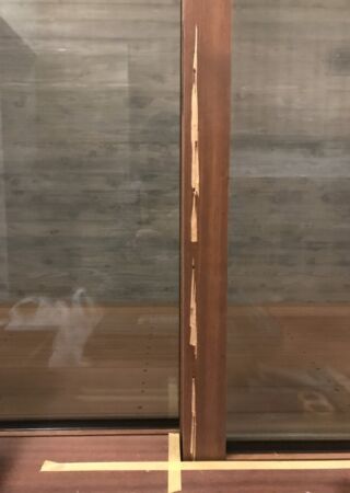 一通りの補修作業を終え帰ろうとしたら現場監督から、木枠サッシに他業者さんが養生をしていたテープを剥がしたら写真のように剥がれてしまい、翌日がオープンハウスのためどうしてもと監督にせがまれ急遽補修することに成りました。